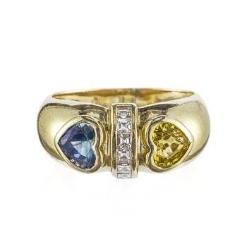 269. Bague sertie d'un saphir et d'un saphir jaune taille cœur séparés par une rangée de diamants taille princesse