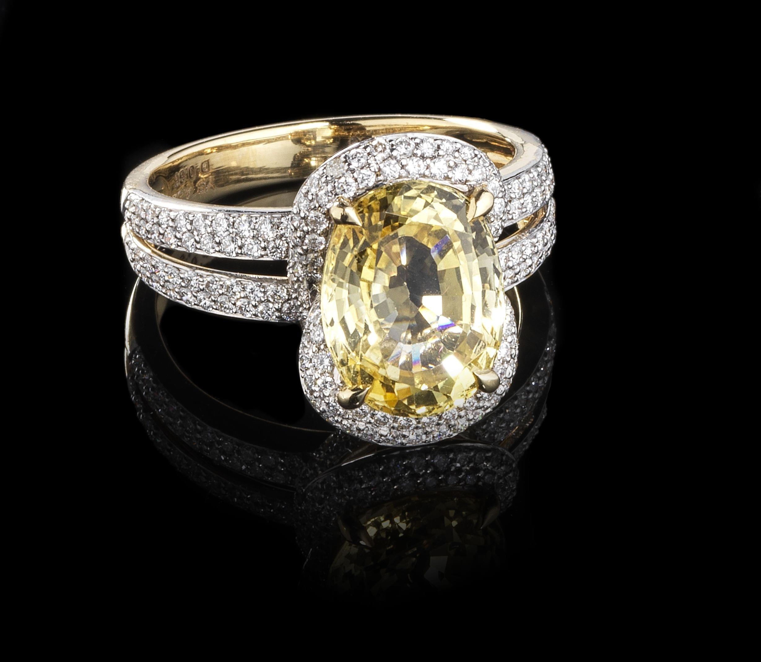 47. Bague sertie d'un saphir jaune Ceylan non chauffé taille ovale (4,52 ct) sur une monture ajourée pavée de diamants (0,66 ct)