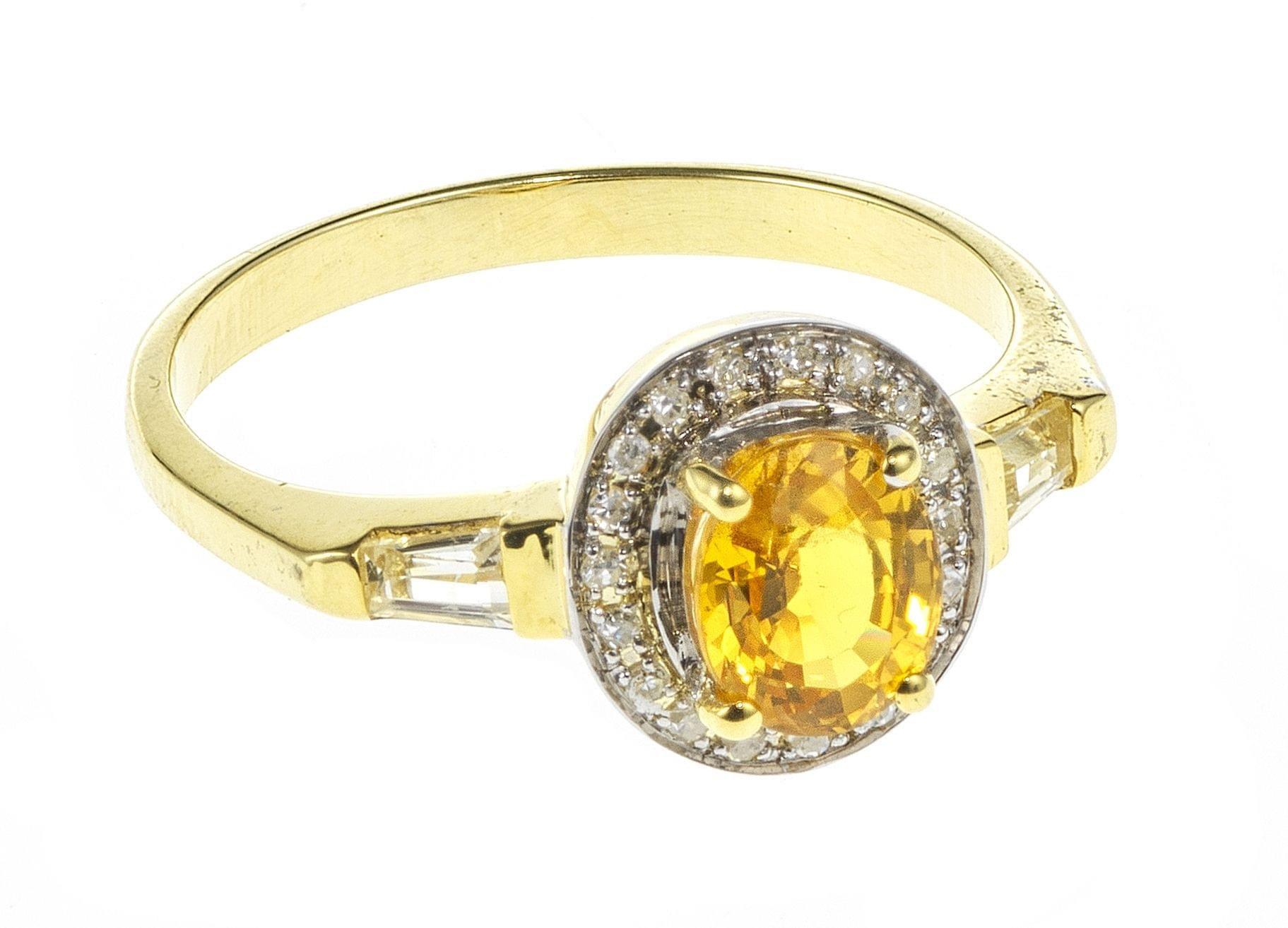 3201. *Bague sertie d'un saphir jaune taille ovale (env. 0,7 ct) entouré de diamants taille brillant et épaulé de diamants taille baguette