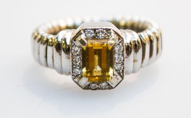 3128. Bague sertie d'un saphir jaune taille rectangulaire entouré de diamants