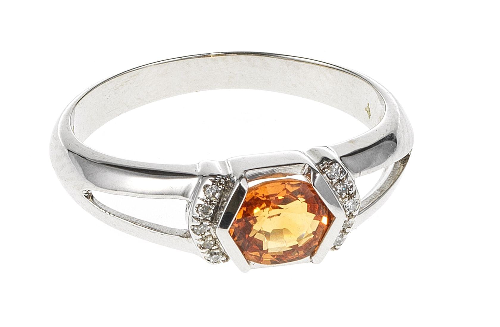 3204. *Bague sertie d'un saphir orange taille ovale (env. 0,6 ct) épaulé de deux lignes de diamants