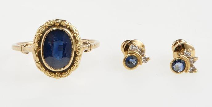 Or 750, doigt 54-14. On joint une paire de clous d'oreilles sertis de saphirs.