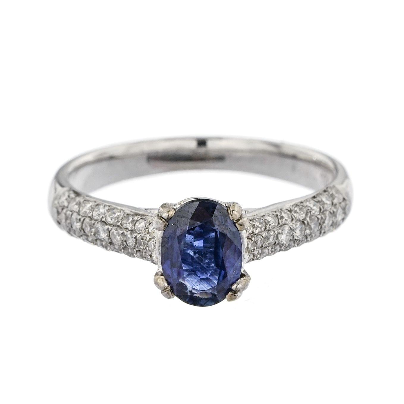 988. Bague sertie d'un saphir ovale (env. 0.9 ct) épaulé d'un pavage de diamants
