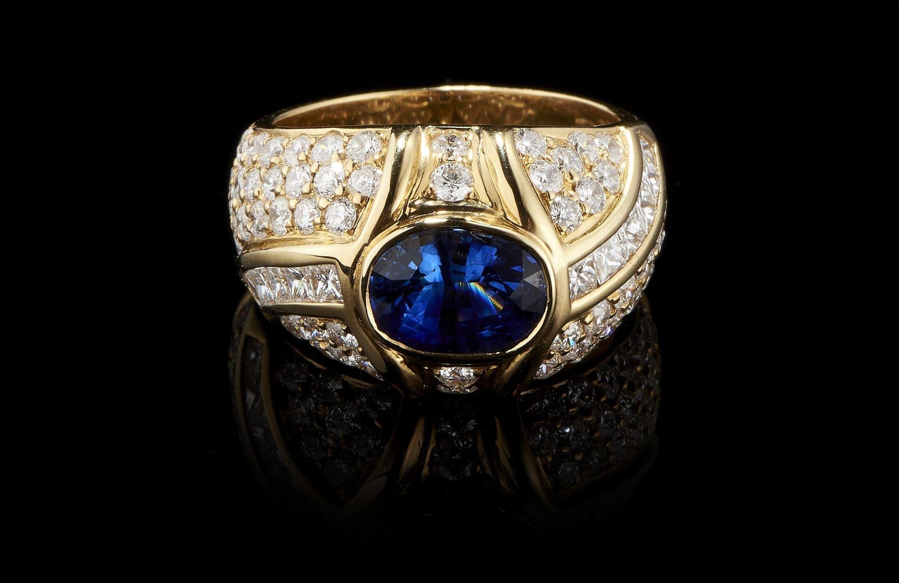 147. Bague sertie d'un saphir ovale (env. 2 ct) dans un pavage de diamants (env. 2,5 ct)