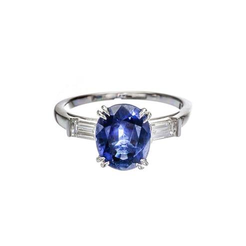 277. Bague sertie d'un saphir ovale (env. 3.3 ct) épaulé de deux diamants taille baguette