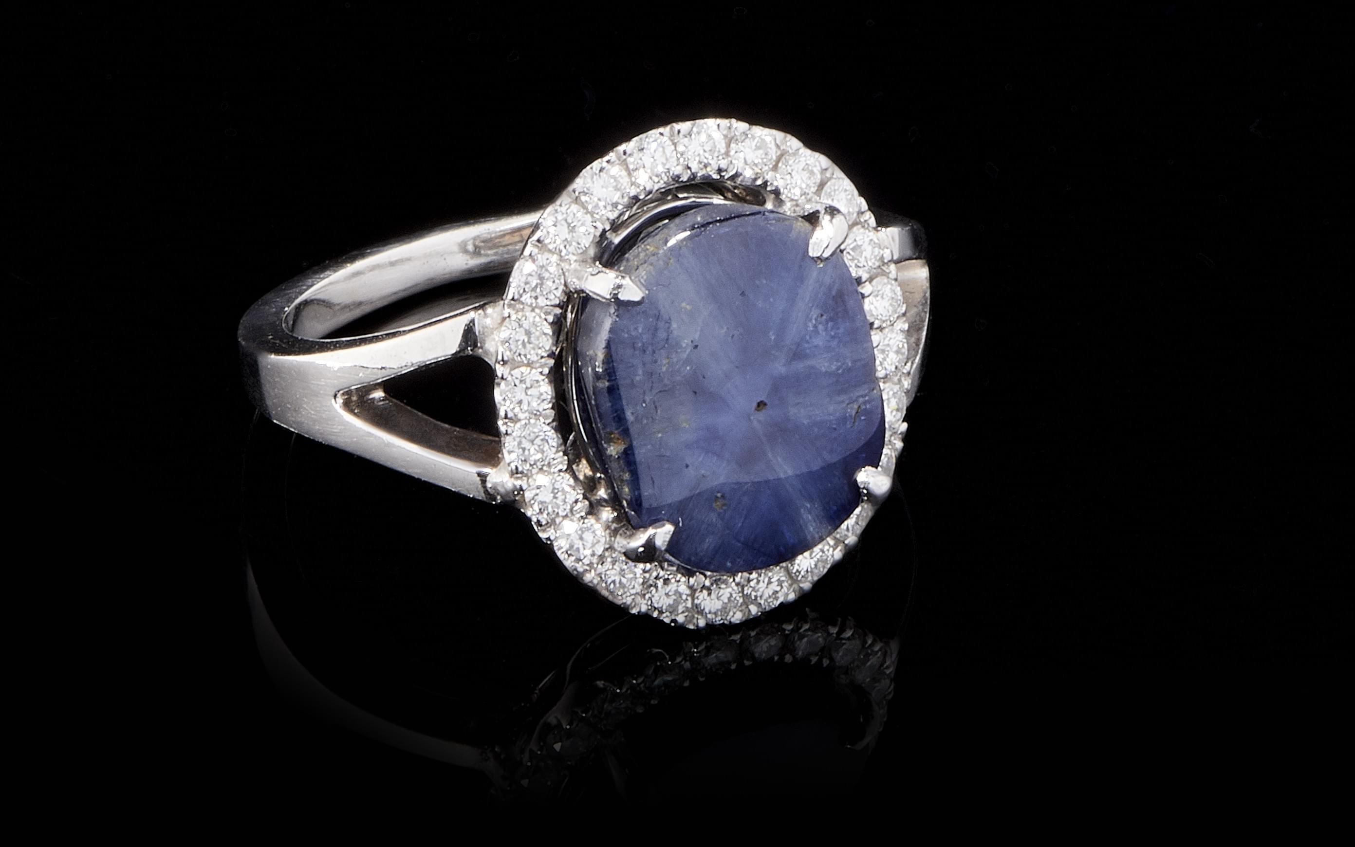 712. Bague sertie d'un saphir ovale trapiche entouré de diamants
