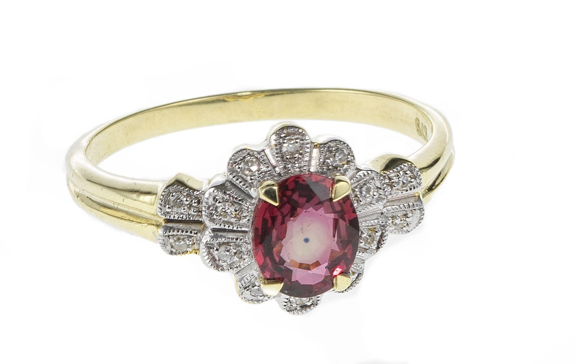 3193. *Bague sertie d'un saphir rose orangé taille ovale (env. 0,6 ct) entouré et épaulé de diamants