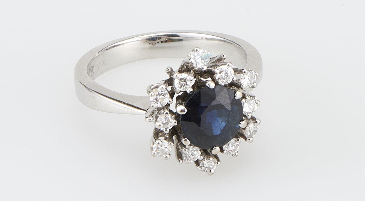3399. Bague sertie d'un saphir taille brillant (env. 1,5 ct) entouré de diamants