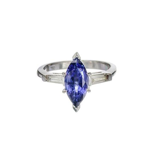 278. Bague sertie d'un saphir taille marquise (env. 2.5 ct) épaulé de deux diamants taille trapèze