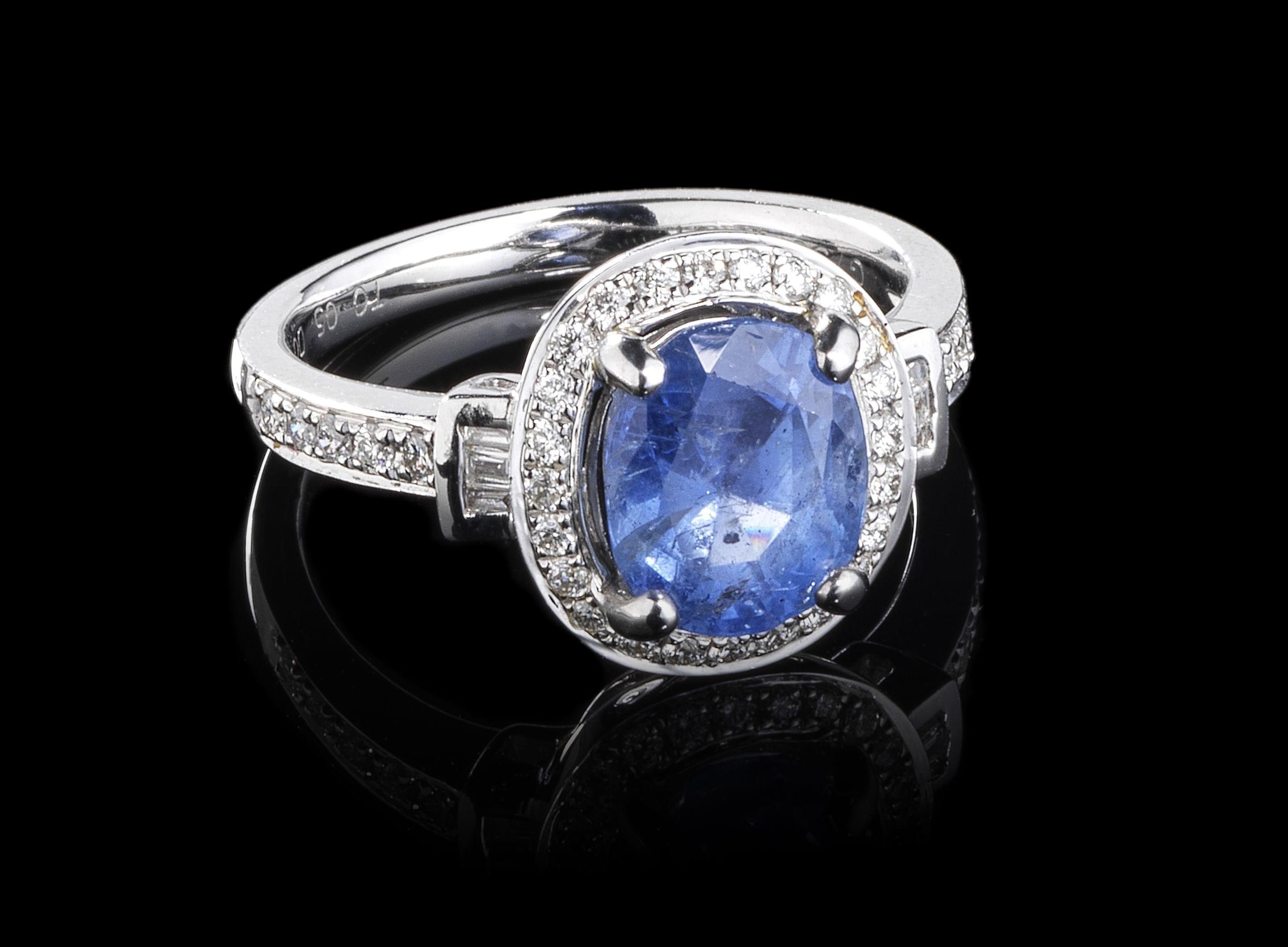 76. Bague sertie d'un saphir taille ovale (1,91 ct) entouré de diamants sur une monture pavée de diamants