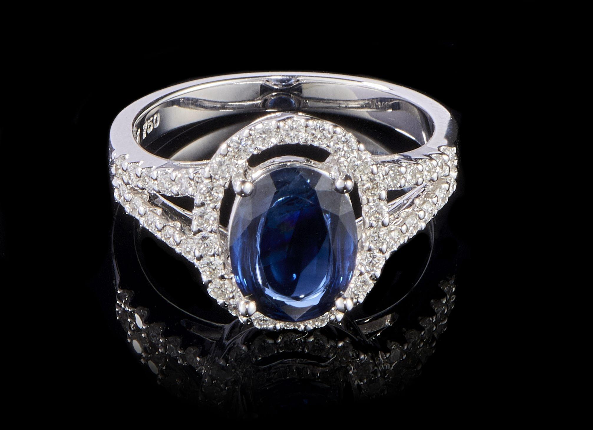 122. Bague sertie d'un saphir taille ovale à la culasse en cabochon (8,9x6,9 mm) entouré et épaulé de diamants (env. 0,3 ct)