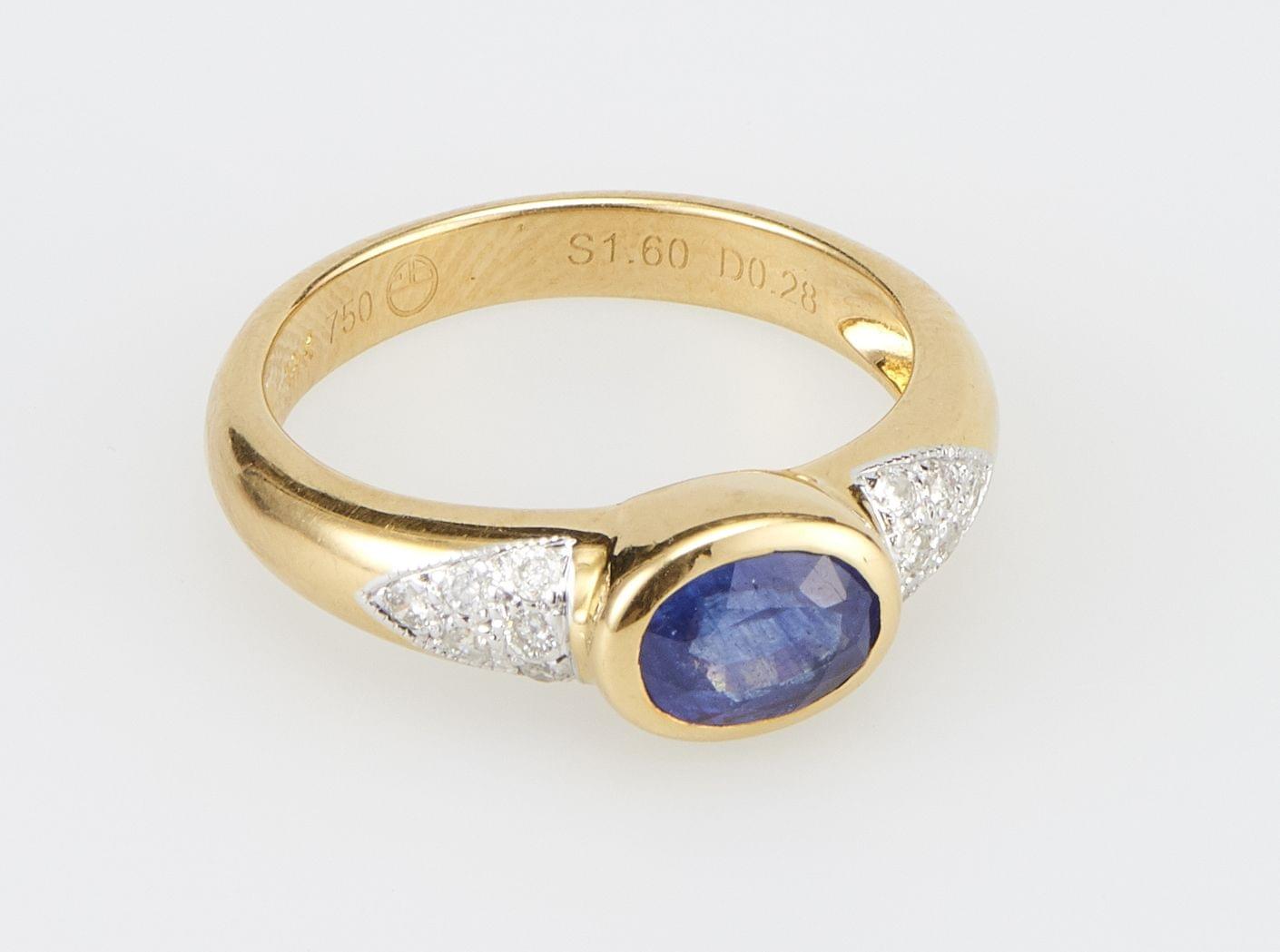 3401. Bague sertie d'un saphir taille ovale (env. 1,6 ct) épaulé de diamants