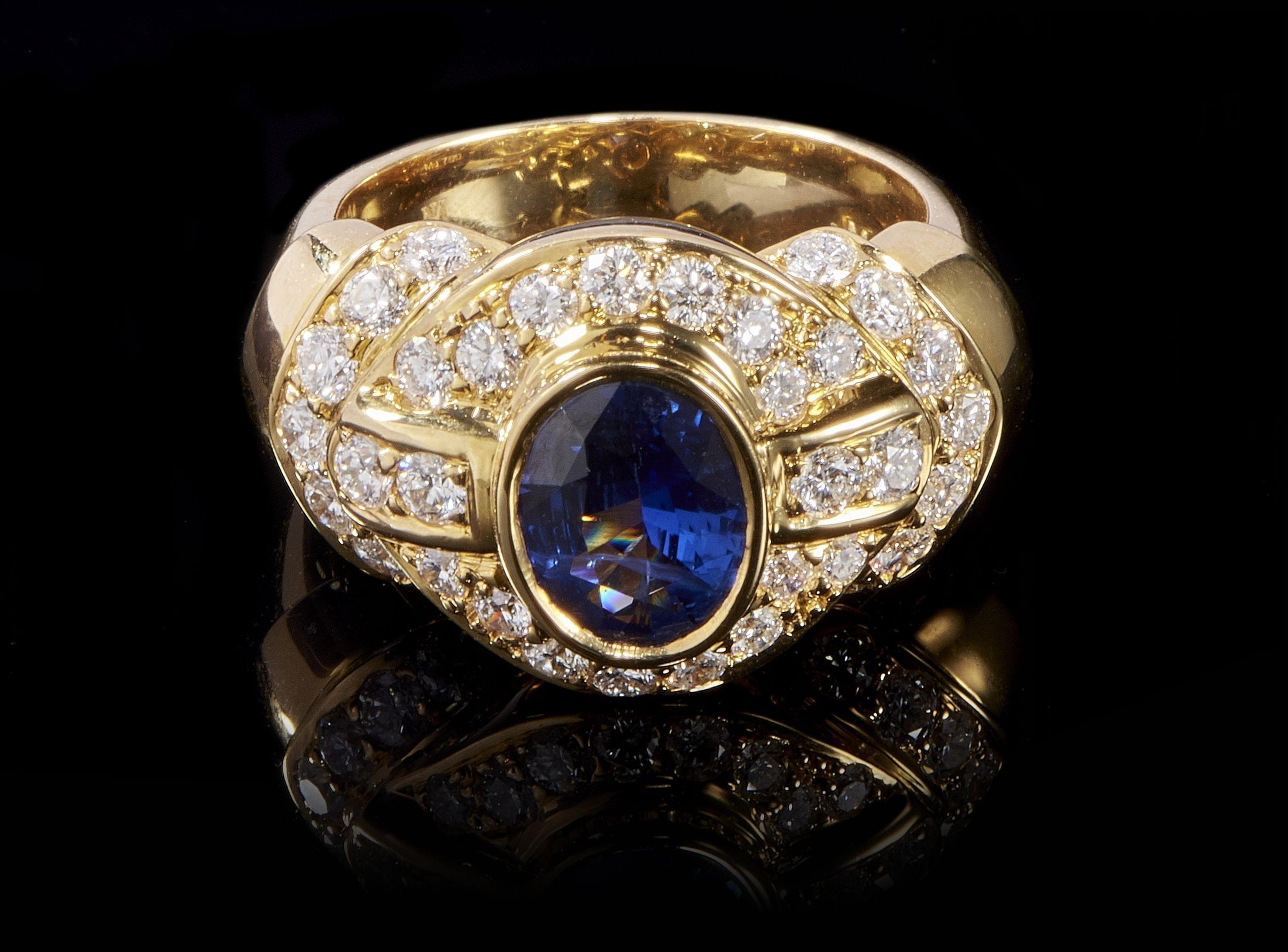 89. Bague sertie d'un saphir taille ovale (env. 1,7 ct) entouré et épaulé de diamants (env. 1,3 ct)