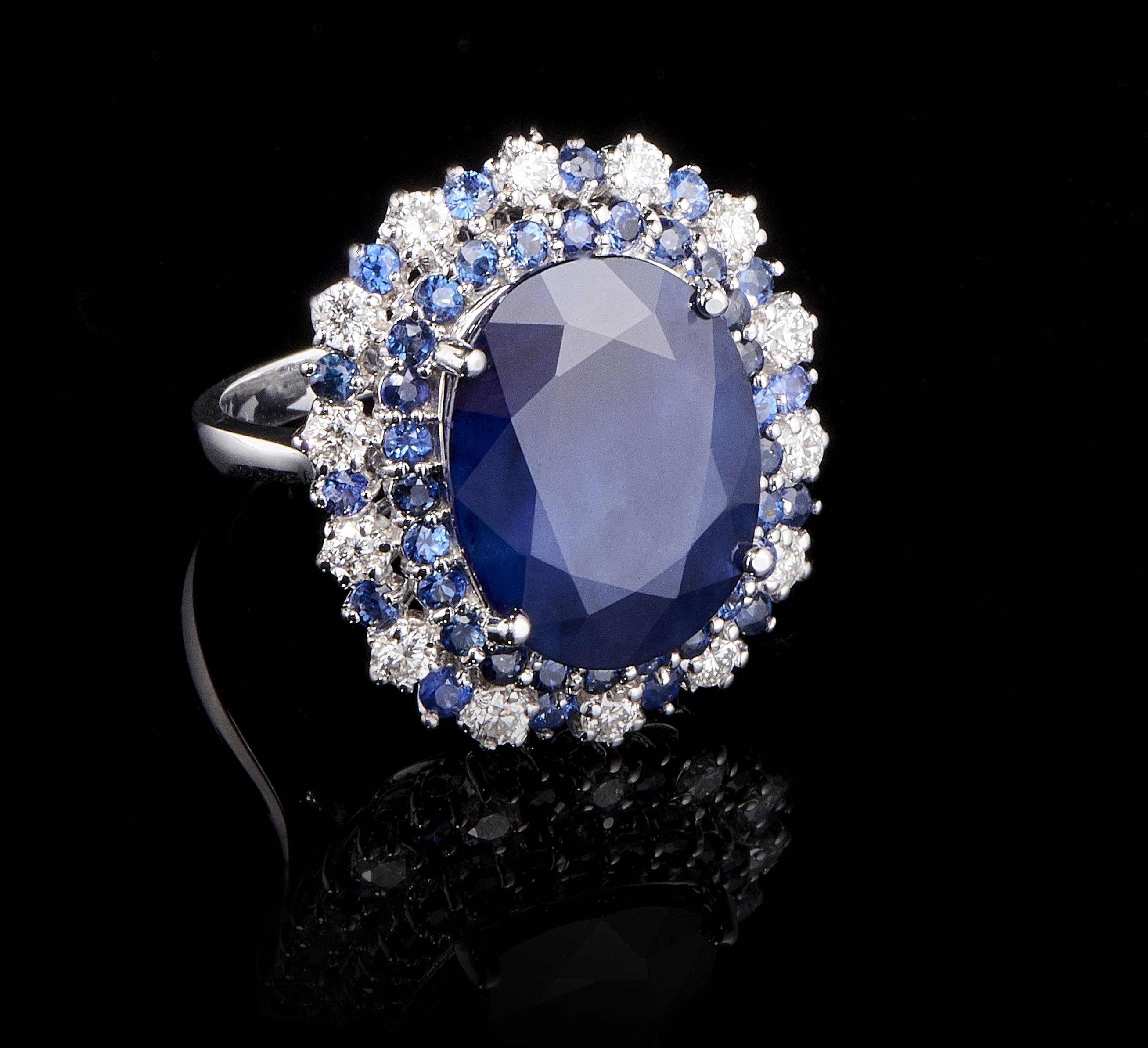 707. Bague sertie d'un saphir taille ovale (env. 8,5 ct) dans un double entourage de saphirs et de diamants