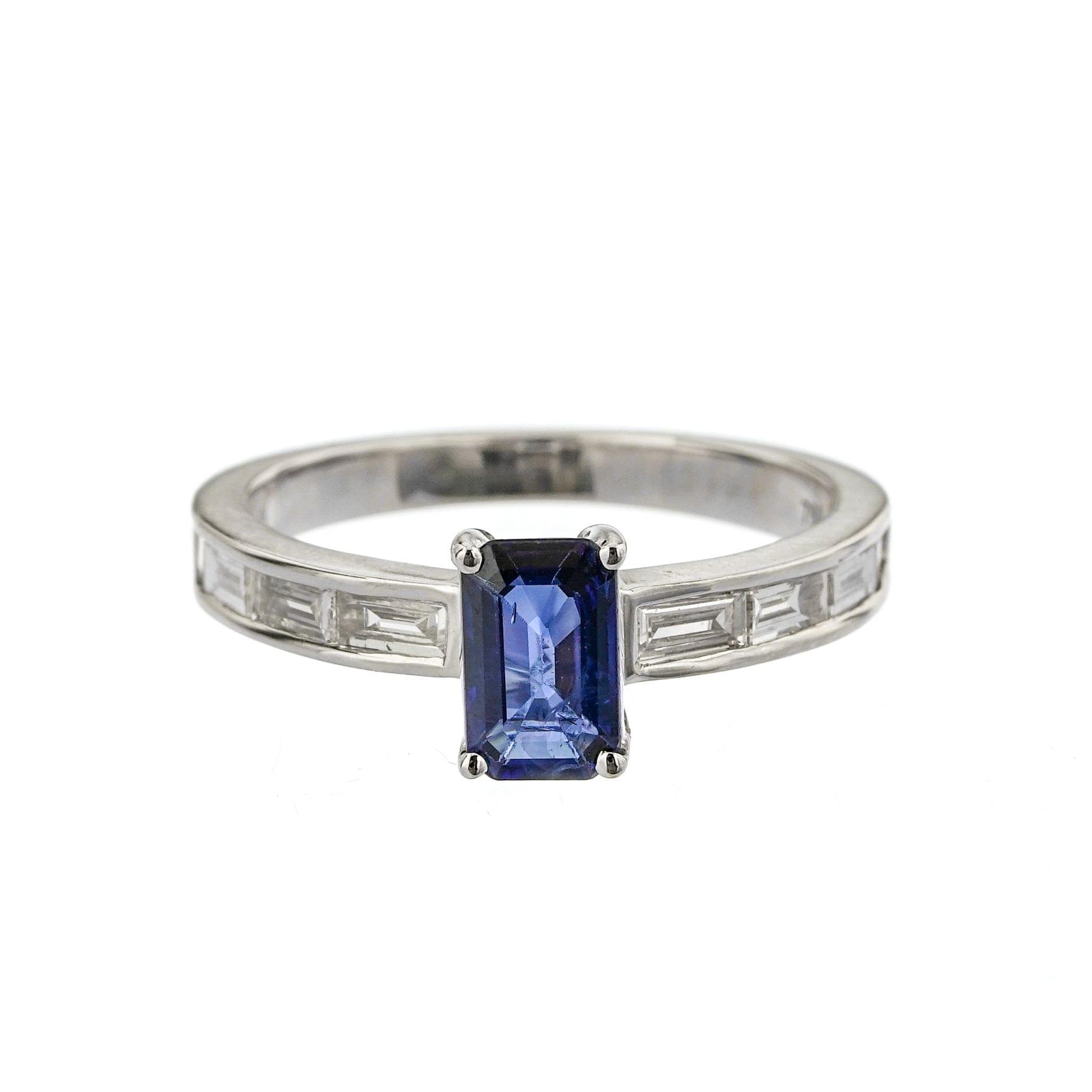 994. Bague sertie d'un saphir taille rectangle (env. 0.8 ct) sur une monture semi-pavée de diamants baguette