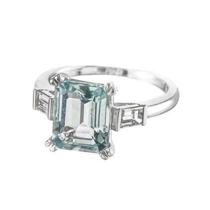 307. Bague sertie d'une aigue-marine taille émeraude épaulée de diamants taille baguette