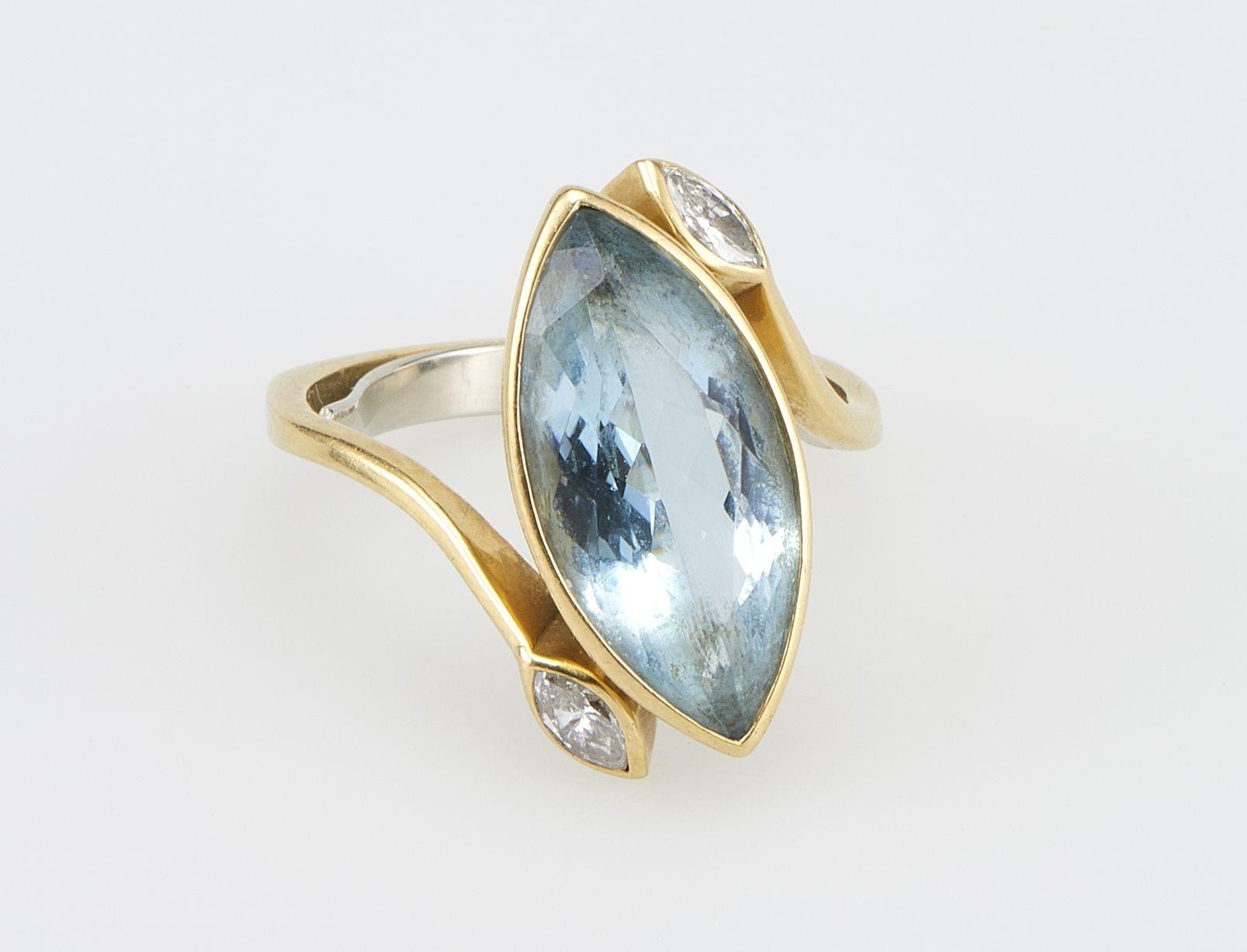 3391. Bague sertie d'une aigue-marine taille marquise (env. 3 ct) rehaussée de diamants taille marquise