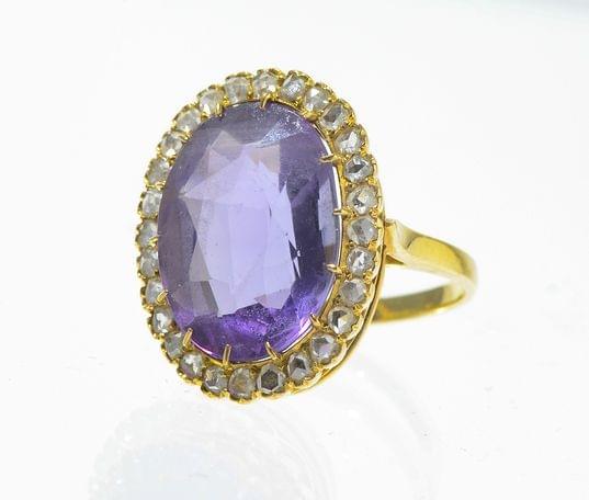 3187. Bague sertie d'une améthyste (env. 8 cts) entourée de diamants