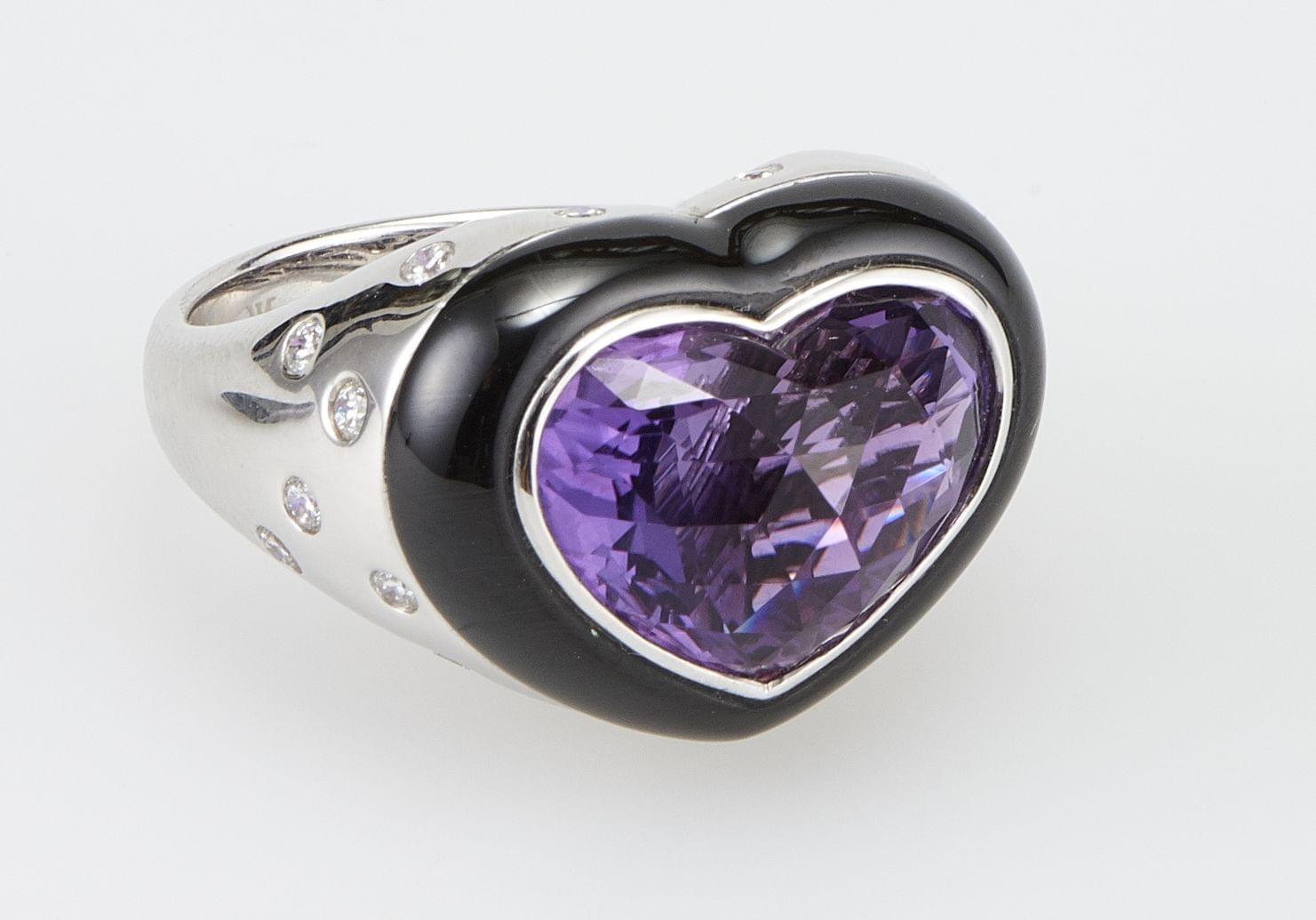 3422. Bague sertie d'une améthyste taille cœur entourée d'onyx et rehaussée de diamants