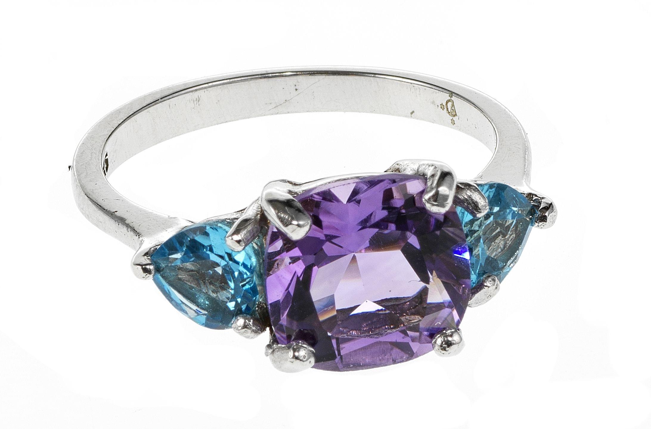 3016. *Bague sertie d'une améthyste taille coussin (env. 2 ct) épaulée de topazes taille coeur