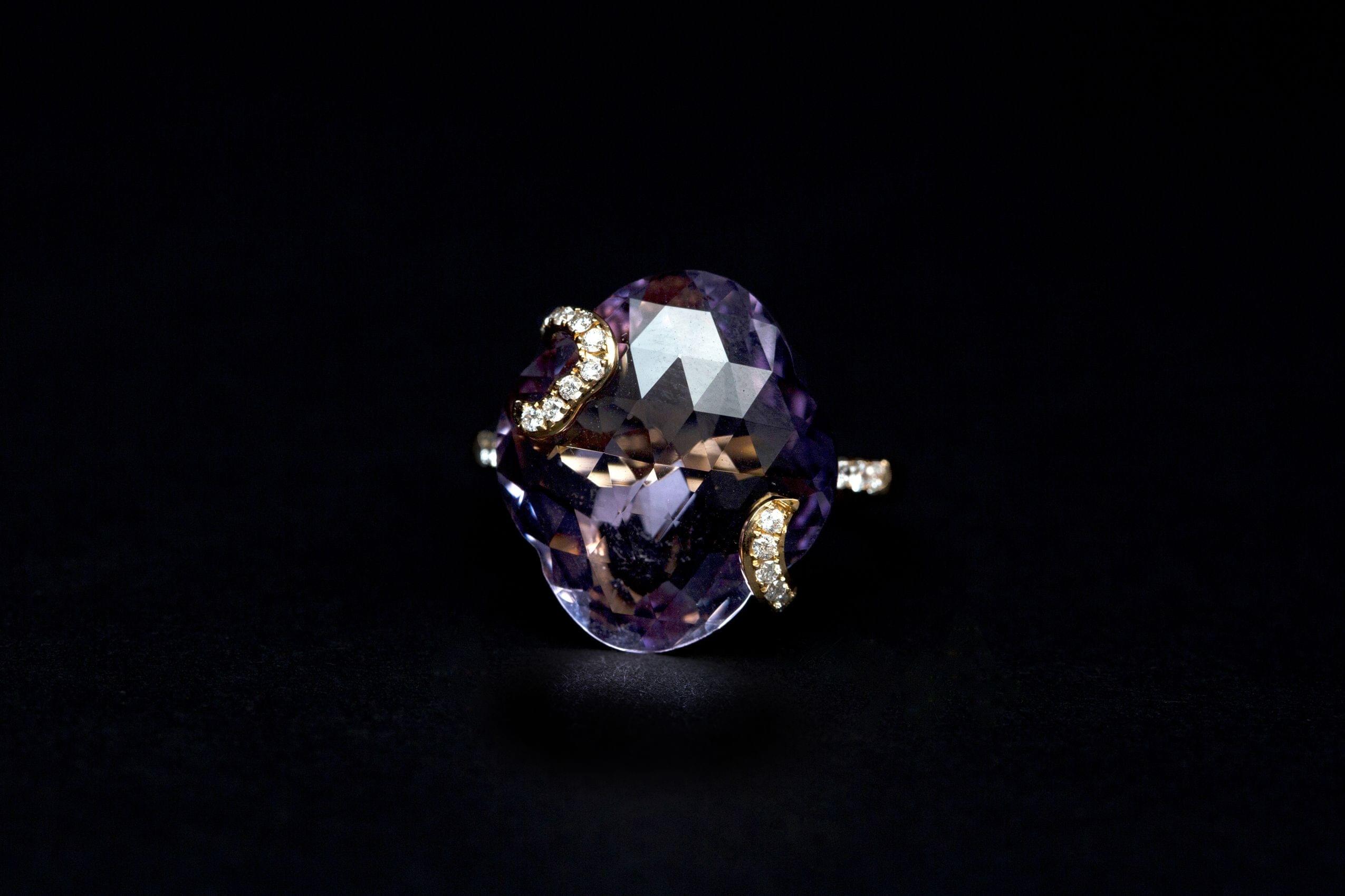 807. Bague sertie d'une améthyste taille fantaisie (env. 9 ct) rehaussée de diamants