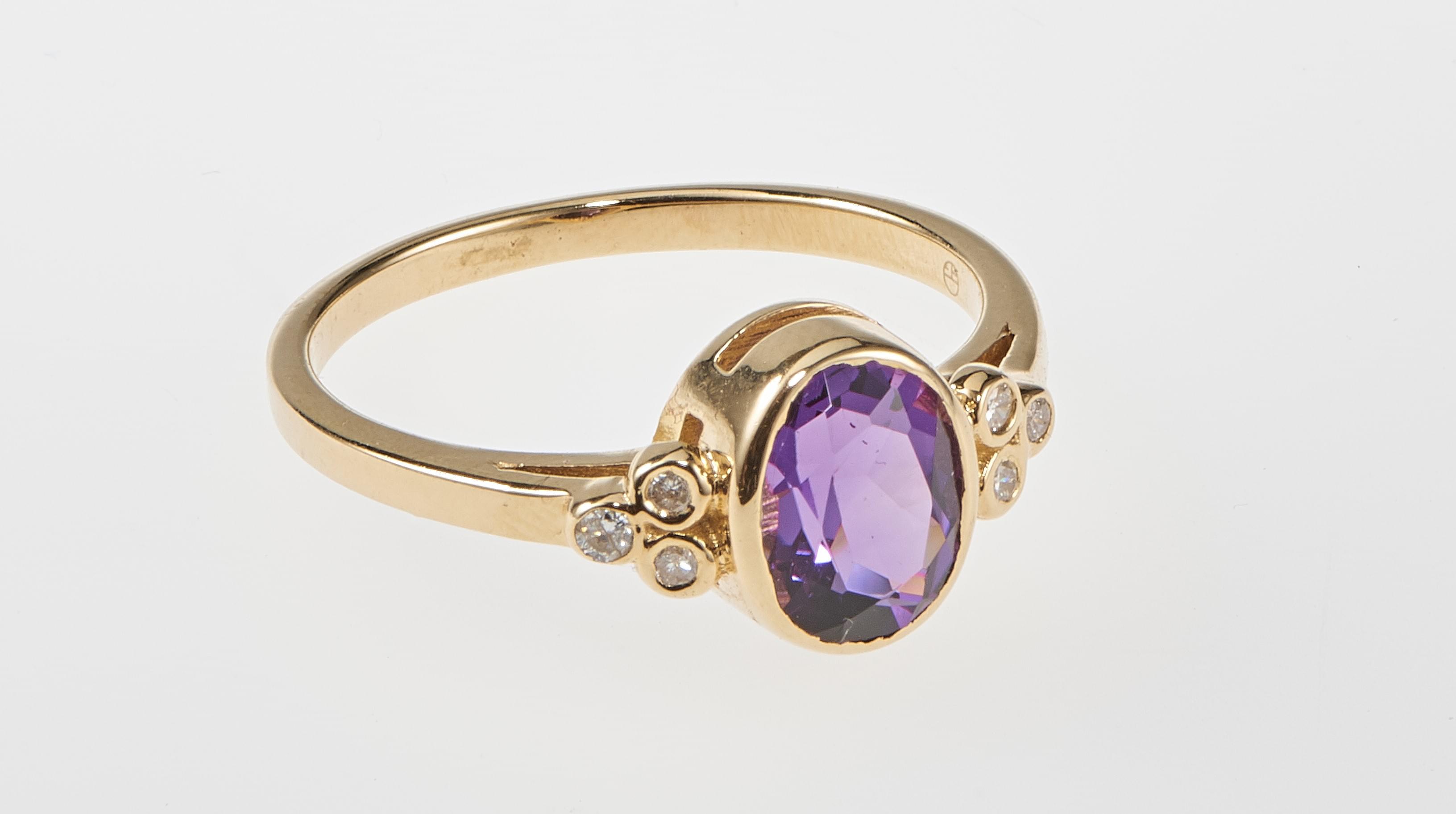 3281. Bague sertie d'une améthyste taille ovale (env. 1,4 ct) épaulée de diamants
