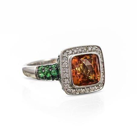 145. Bague sertie d’une citrine entourée de diamants et de tsavorites