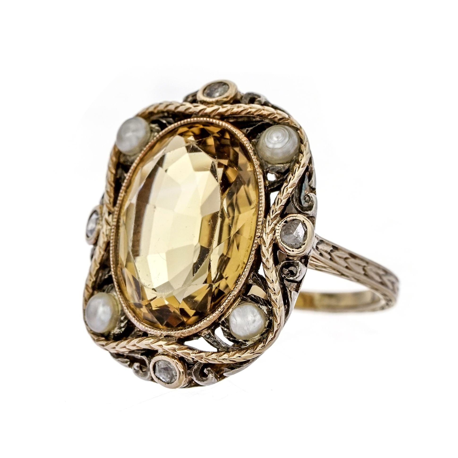 896. Bague sertie d'une citrine ovale (env. 6 ct) entourée de perles et de roses de diamant