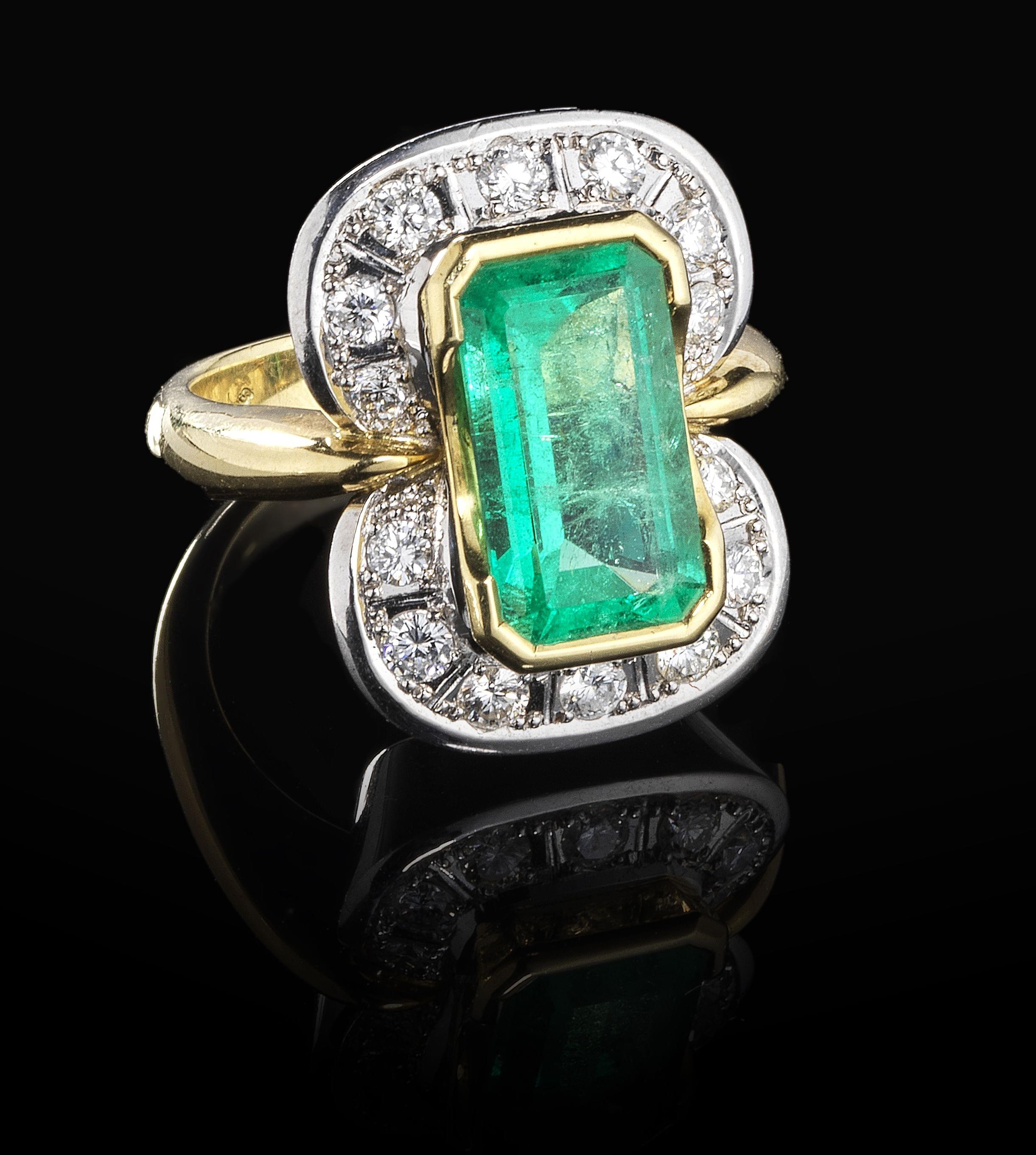 39. *Bague sertie d'une émeraude colombienne taille émeraude (3,42 ct) entourée de diamants (env. 0,6 ct)