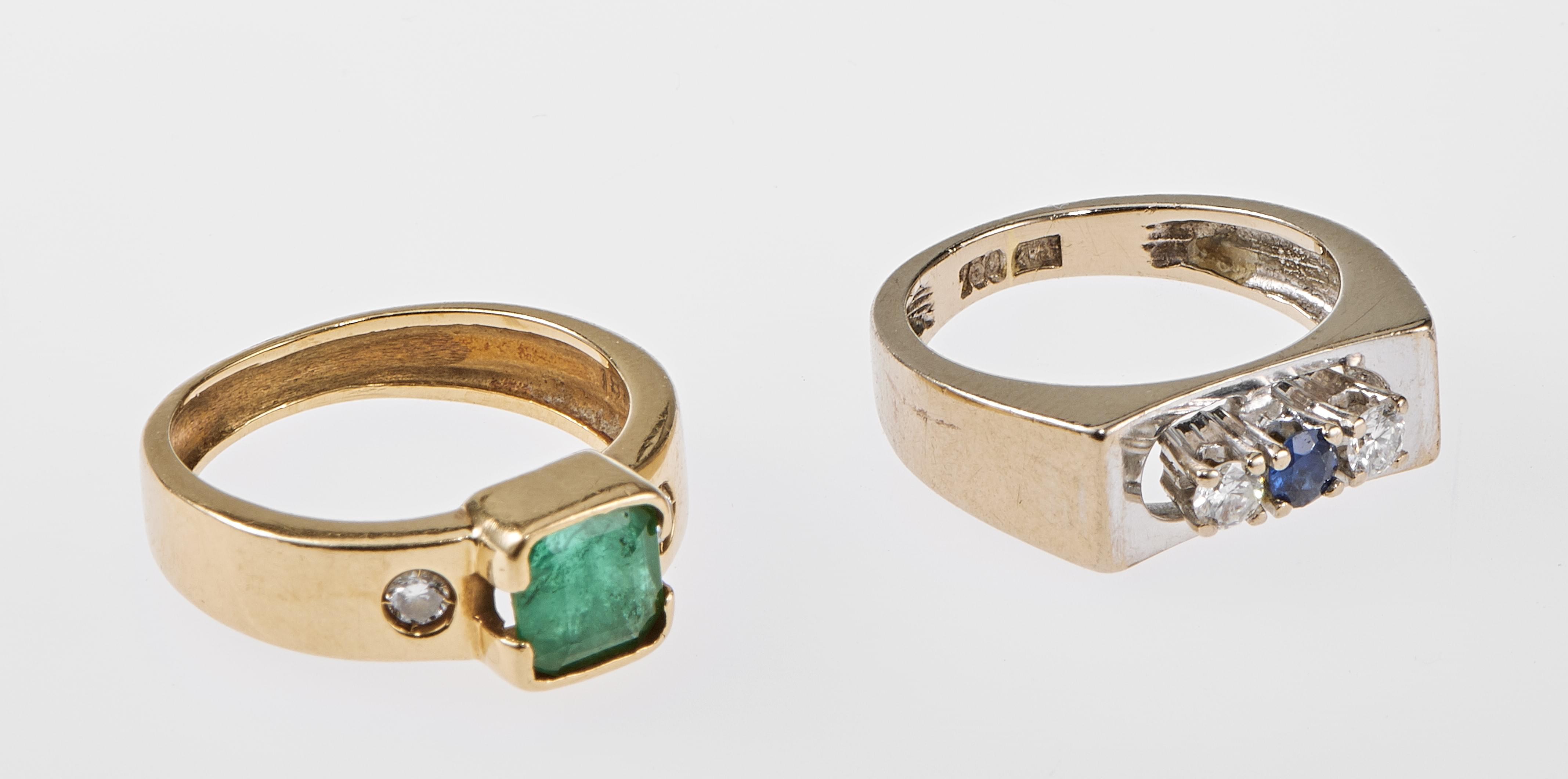 Or 750, doigt 46-6. On joint une bague sertie d'un petit saphir épaulé de deux diamants, or gris 750, doigt 46-6.