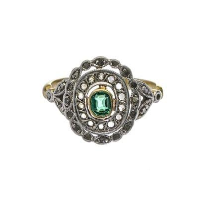 213. Bague sertie d'une émeraude ovale entourée de roses de diamants