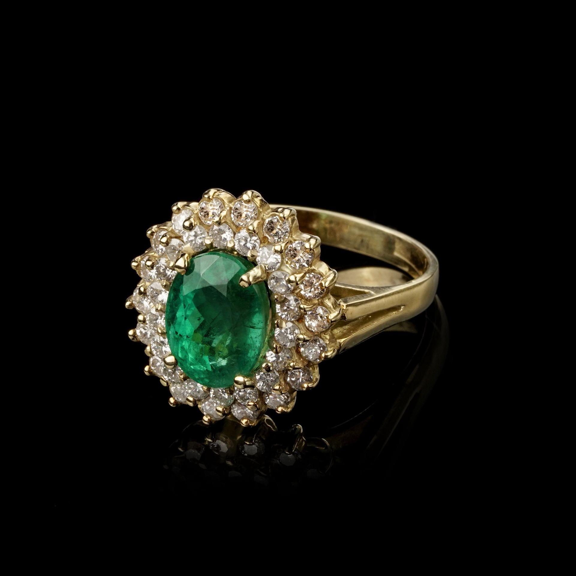 736. Bague sertie d'une émeraude ovale (env. 2 ct) dans un double entourage de diamants (env. 1,7 ct)
