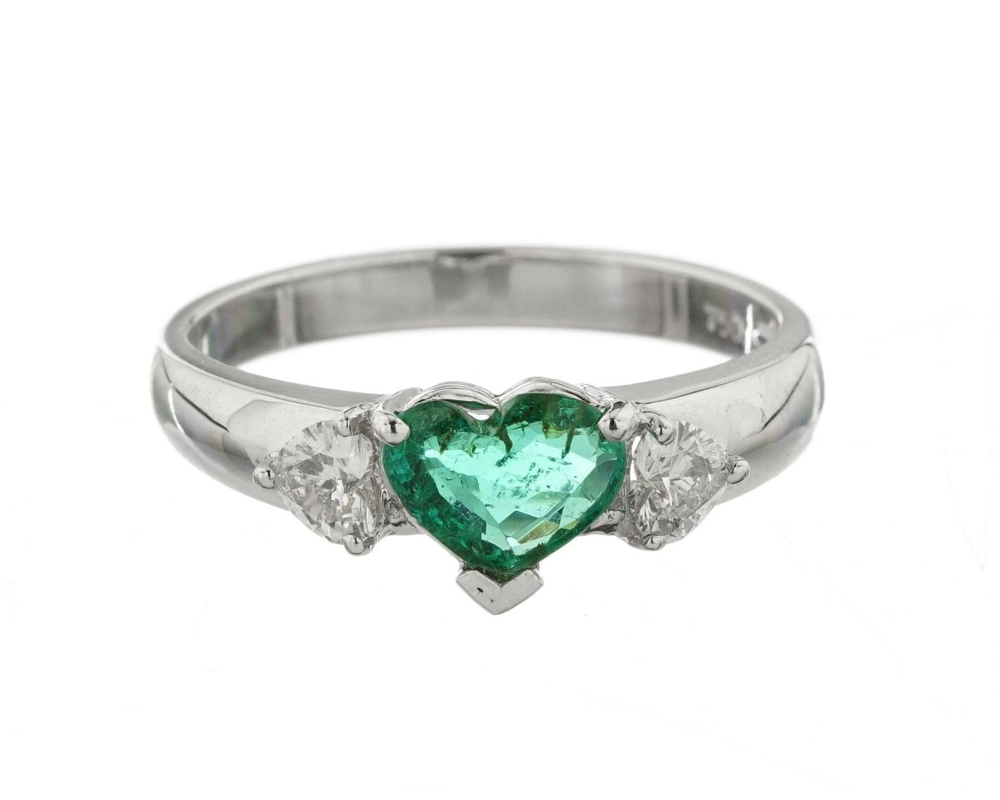 3195. Bague sertie d'une émeraude taille cœur (env. 0.6 ct) épaulée de deux diamants taille cœur
