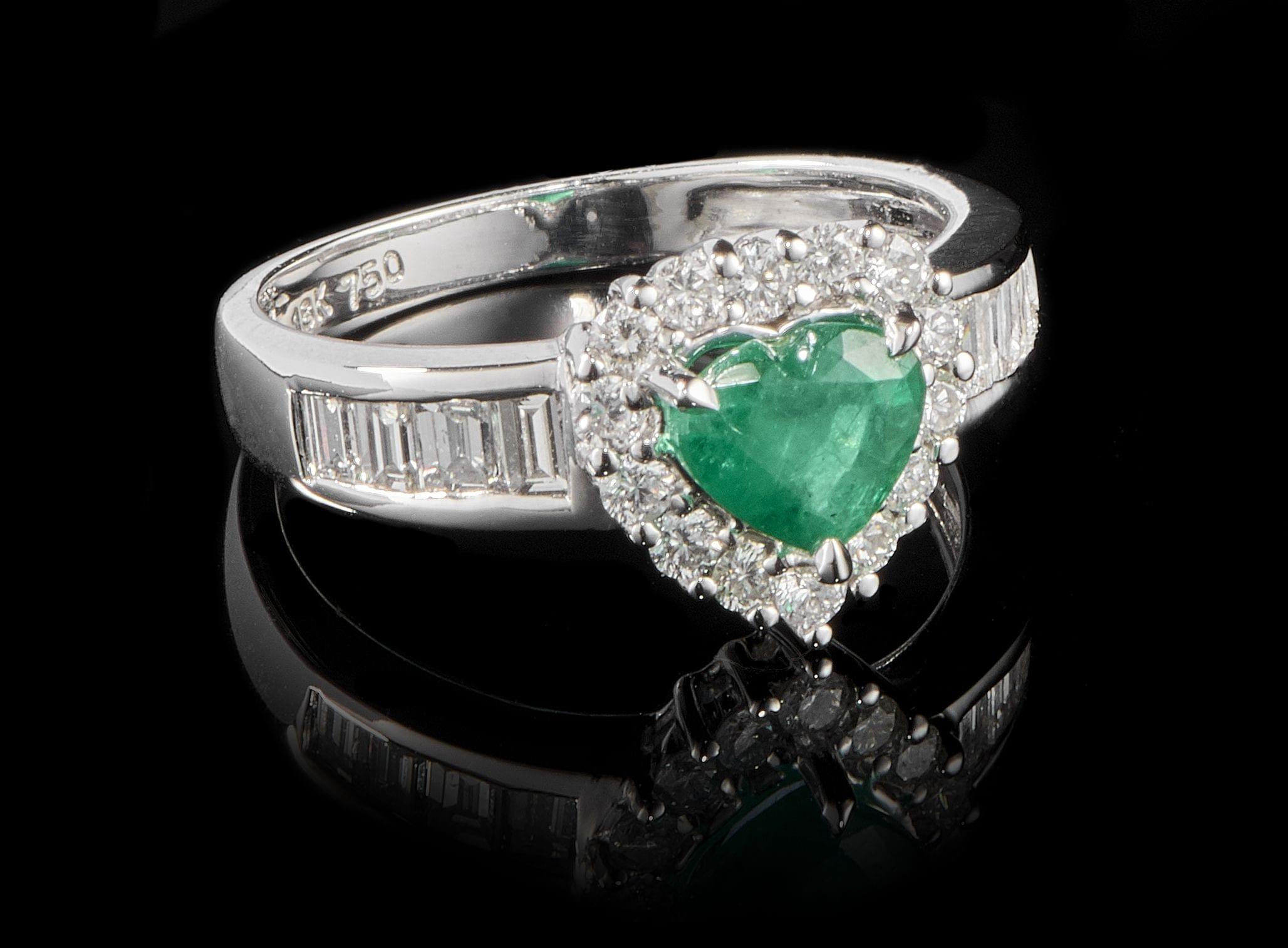 128. Bague sertie d'une émeraude taille cœur (env. 0,7 ct) entourée de diamants et épaulée de diamants taille baguette (env. 1 ct)