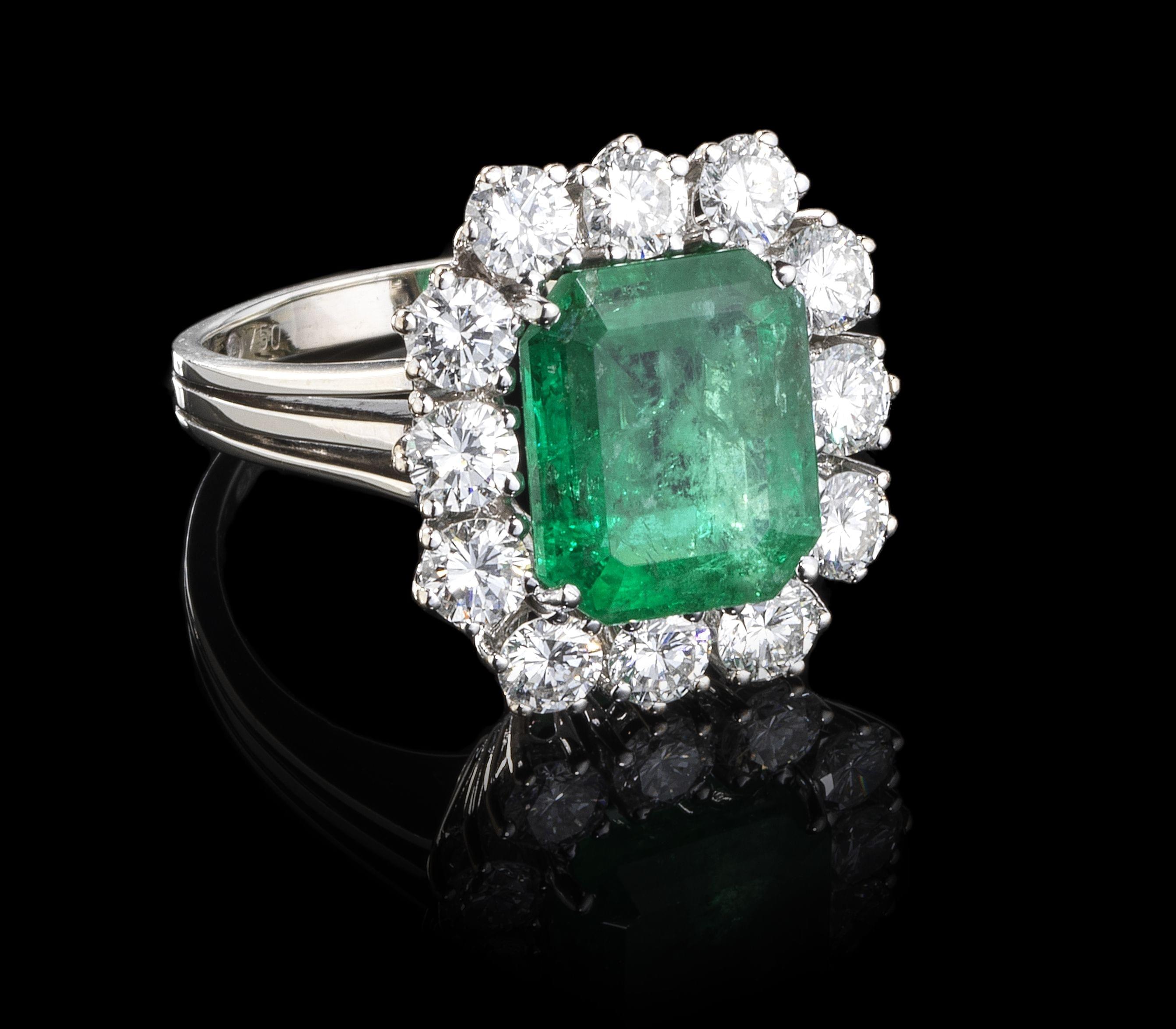 85. Bague sertie d'une émeraude taille émeraude (env. 4 ct) entourée de diamants (total env. 1,2 ct)