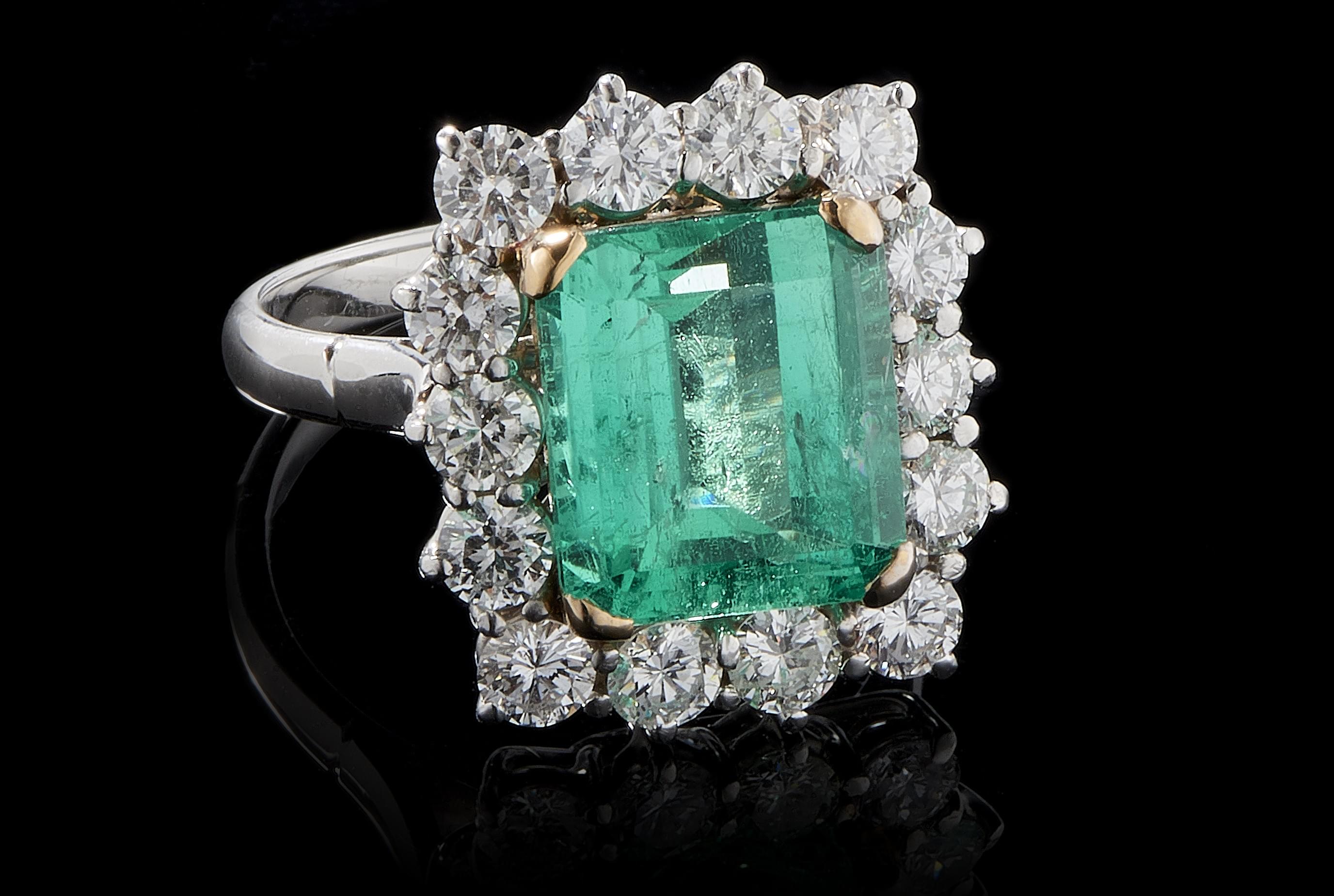 1062. Bague sertie d'une émeraude taille émeraude (env. 6,3 ct) entourée de diamants (env. 2 ct)
