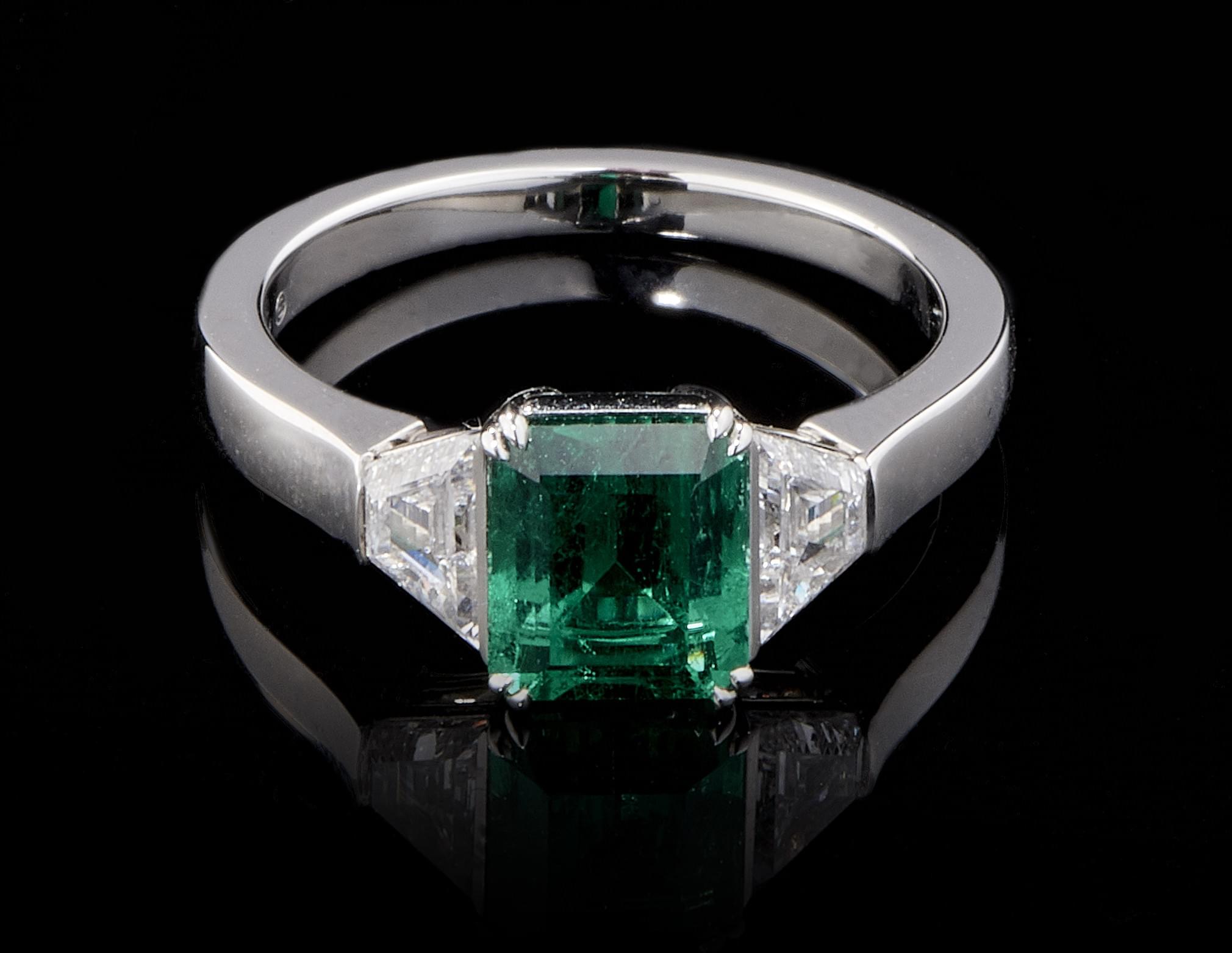 704. Bague sertie d'une émeraude taille émeraude (env. 1,3 ct) épaulée de deux diamants taille trapèze