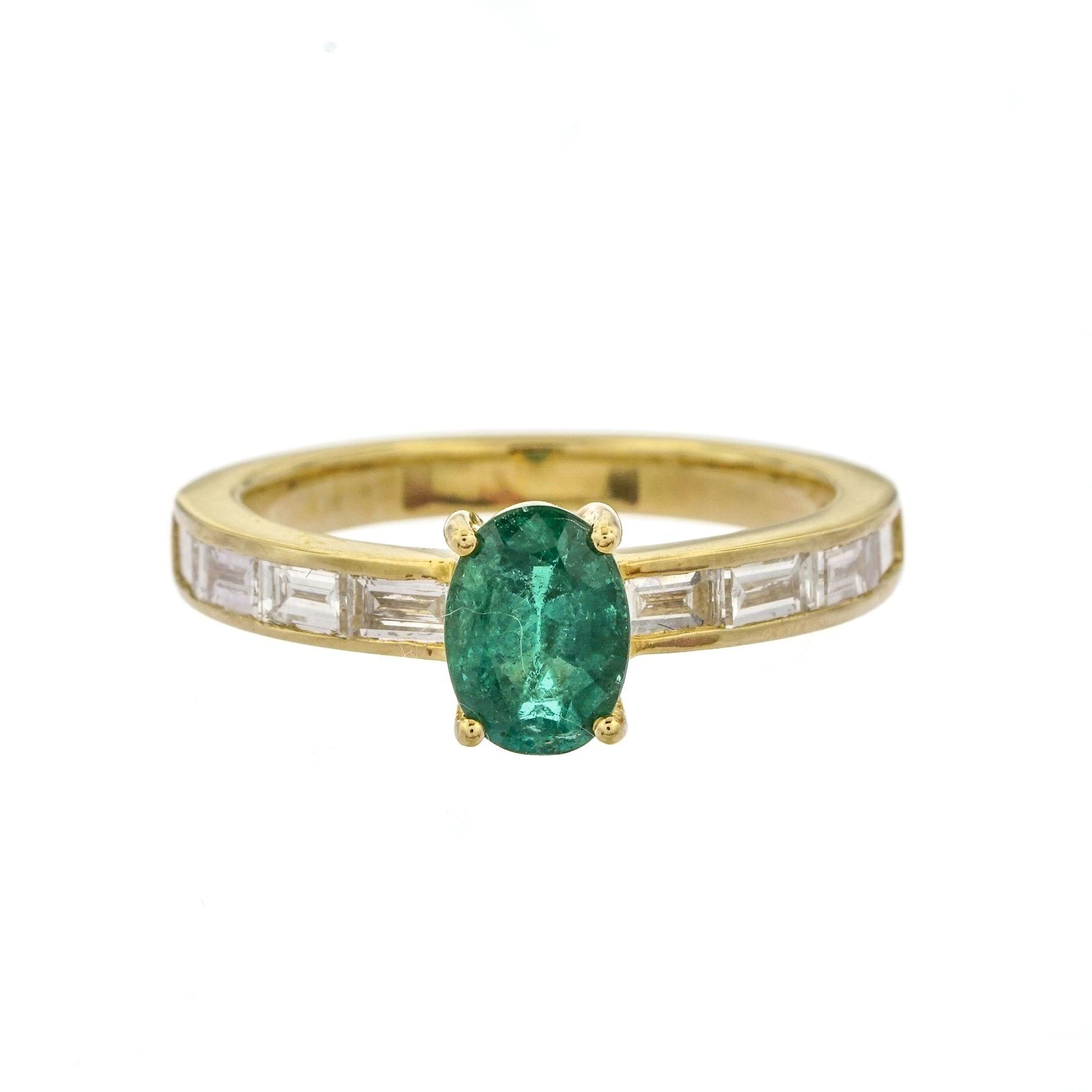 964. Bague sertie d'une émeraude taille ovale (env. 0.7 ct) sur une monture semi-pavée de diamants baguette