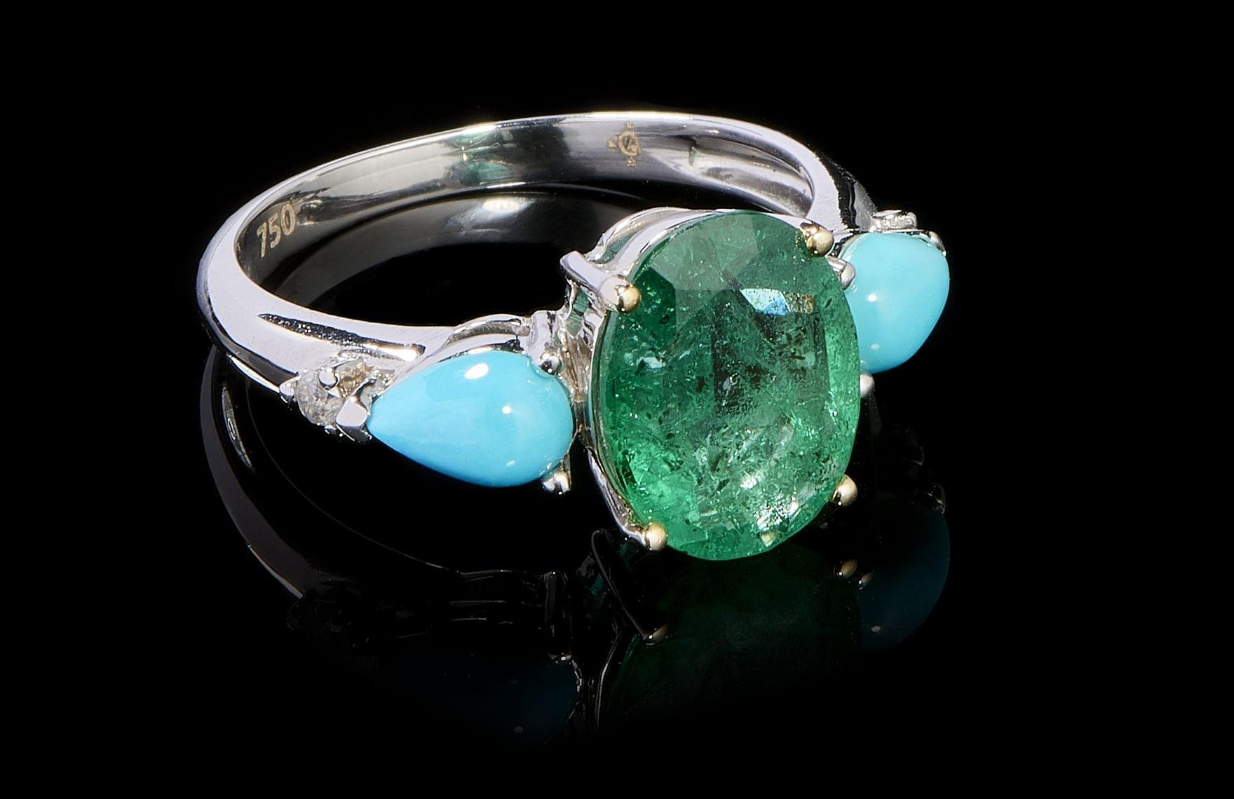 Epaulée de deux turquoises taille cabochon poire et de deux diamants, or gris 750, doigt 52-12, 3 g