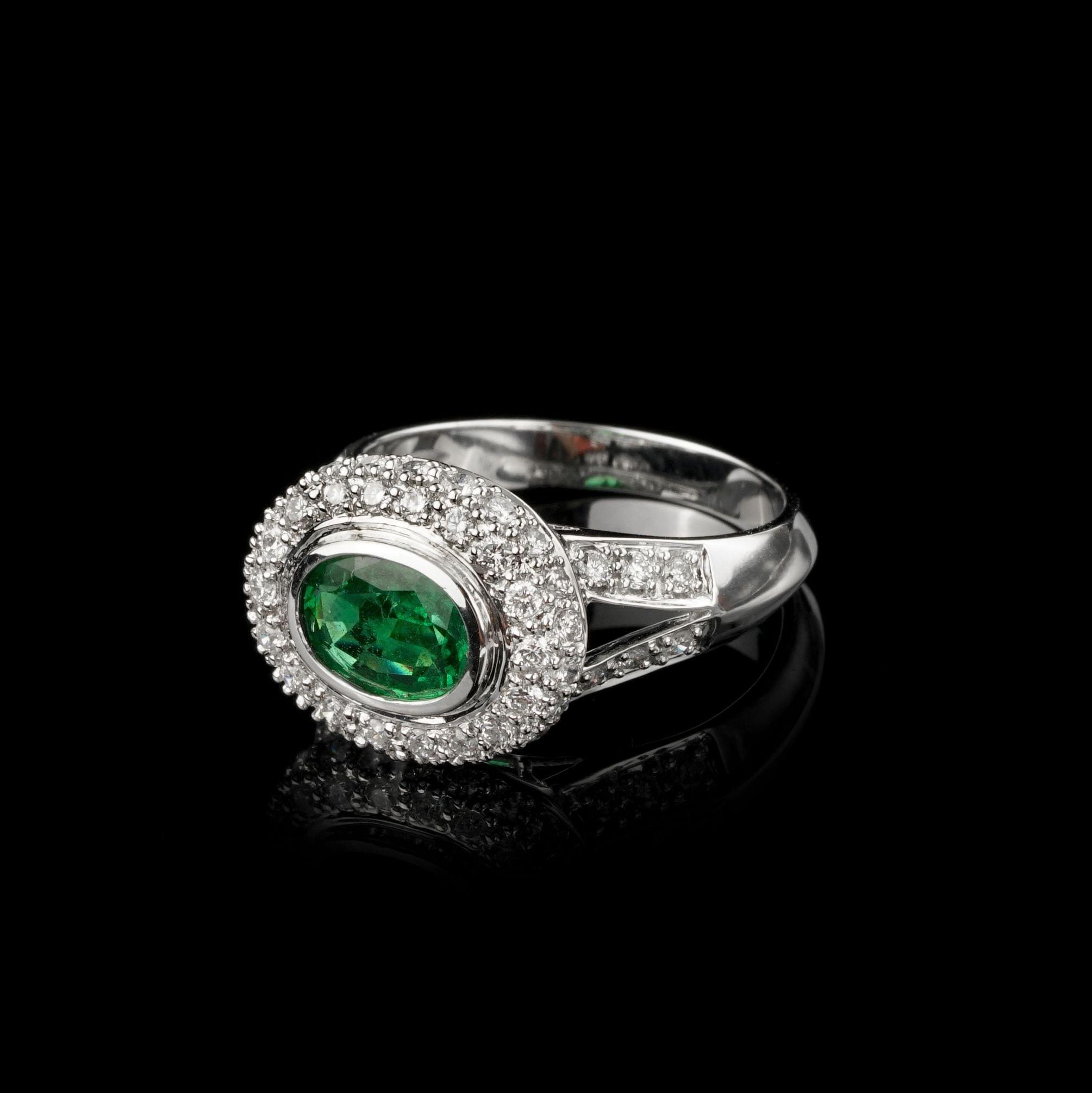 782. Bague sertie d'une émeraude taille ovale (env. 1 ct) entourée de diamants (env. 0,7 ct)