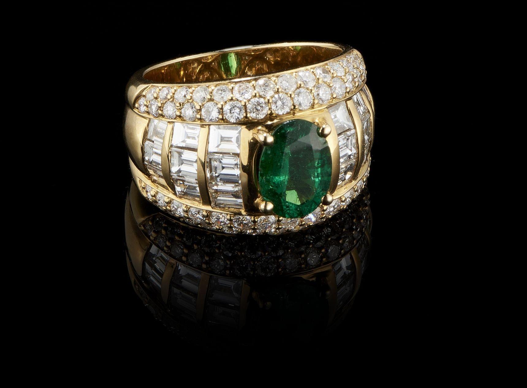 157. Bague sertie d'une émeraude taille ovale (env. 1,5 ct) épaulée de diamants taille baguette et rehaussée de lignes de diamants (env. 1,5 ct)