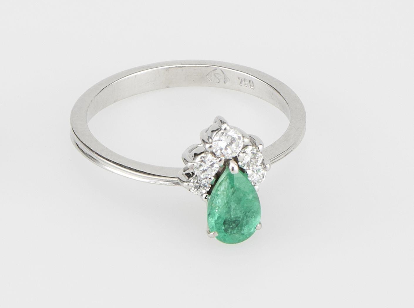3266. Bague sertie d'une émeraude taille poire (env. 0,6 ct) rehaussée de diamants