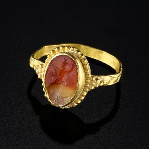 A motif d'une figure féminine, or jaune, travail de granulation, doigt 62-22, monture probablement postérieure, 4 g. Provenance: Collection privée suisse