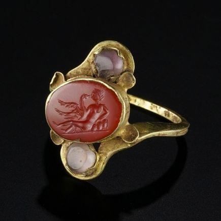 852. Bague sertie d'une intaille sur cornaline entourée de deux améthystes, époque romaine, Ier-IIIe s ap. JC