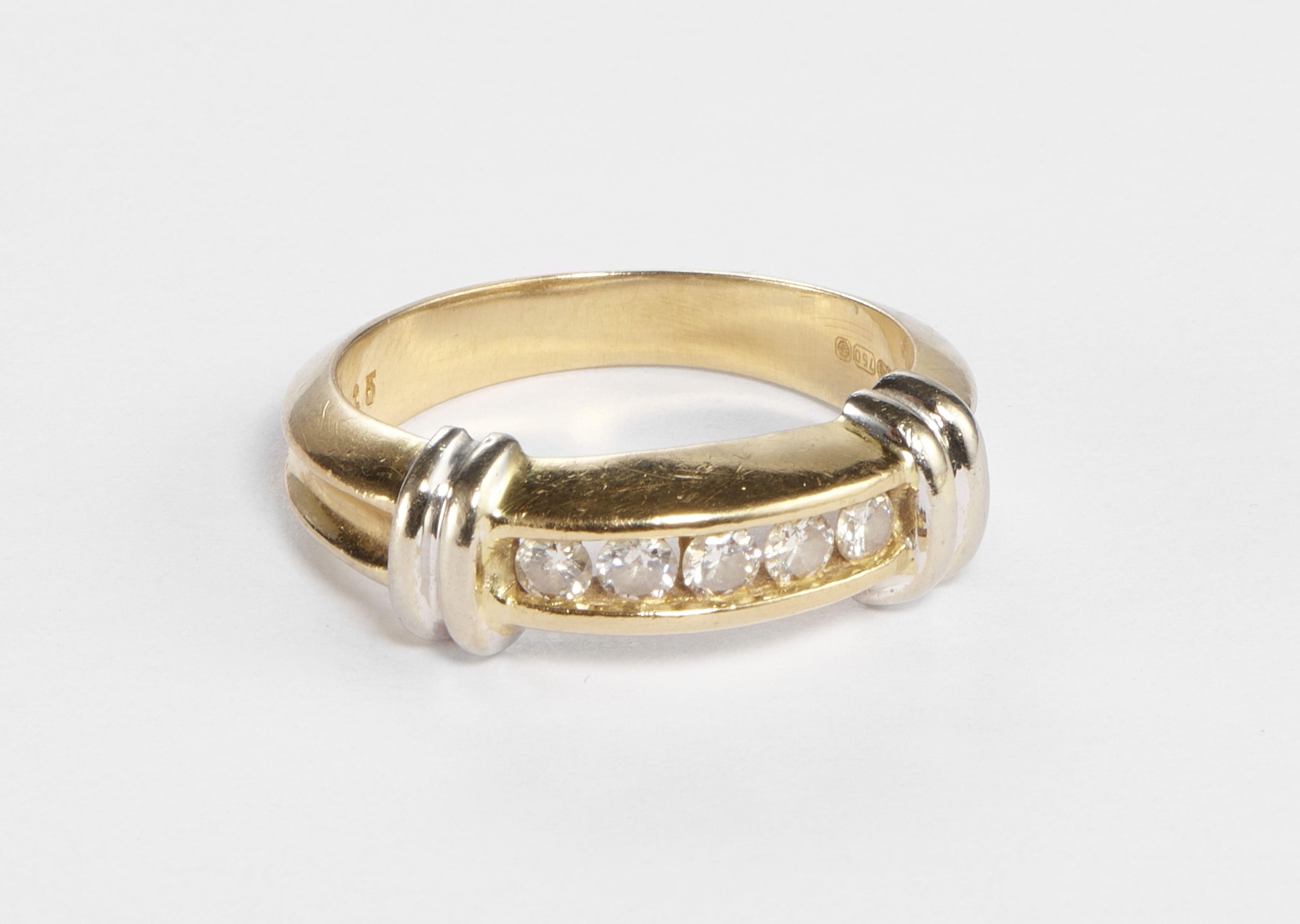 3165. Bague sertie d'une ligne de diamants rehaussée de deux motifs godronnés