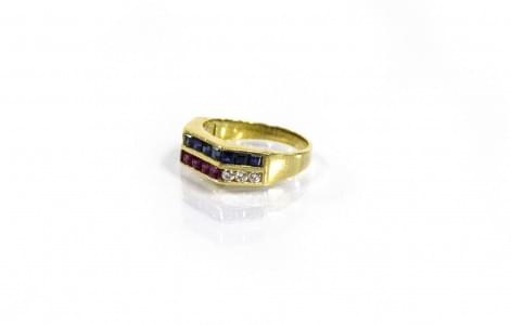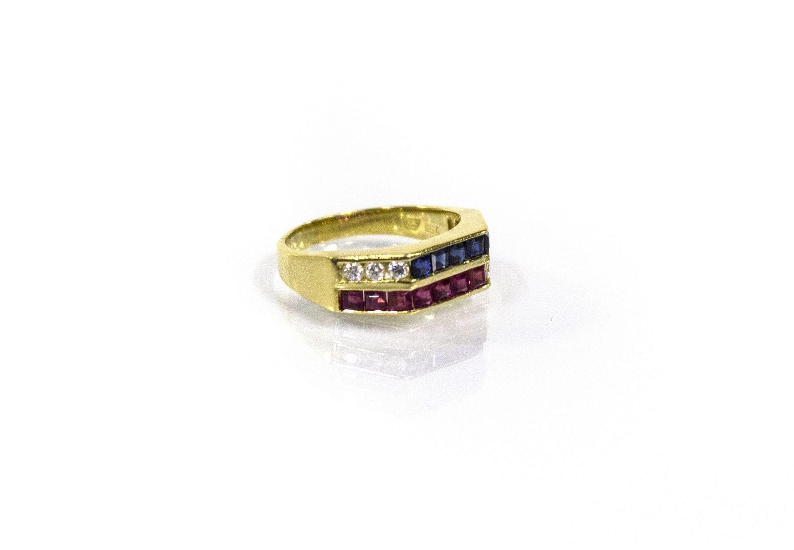 3137. Bague sertie d'une ligne de rubis et d'une ligne de saphirs épaulées de diamants
