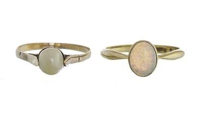 Or 750, doigt 53-13. On joint une bague en or 585 sertie d'une perle, doigt 53-13.