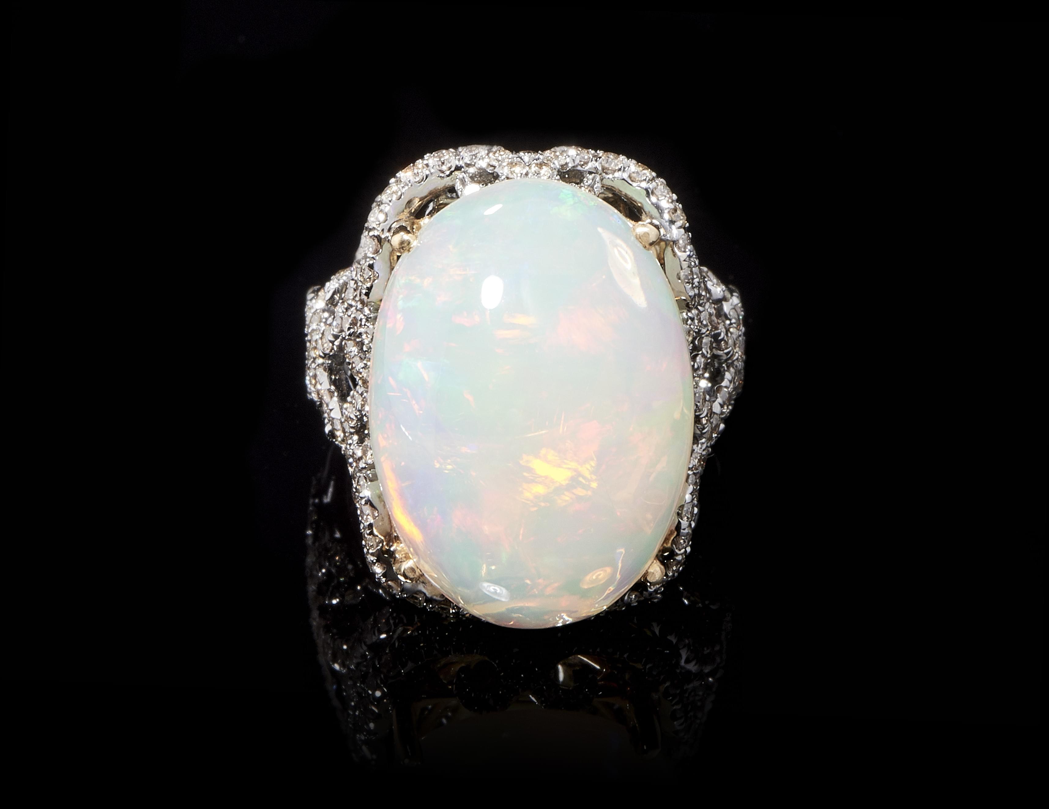 705. Bague sertie d'une opale ovale taille cabochon sur une monture ajourée pavée de diamants cognac