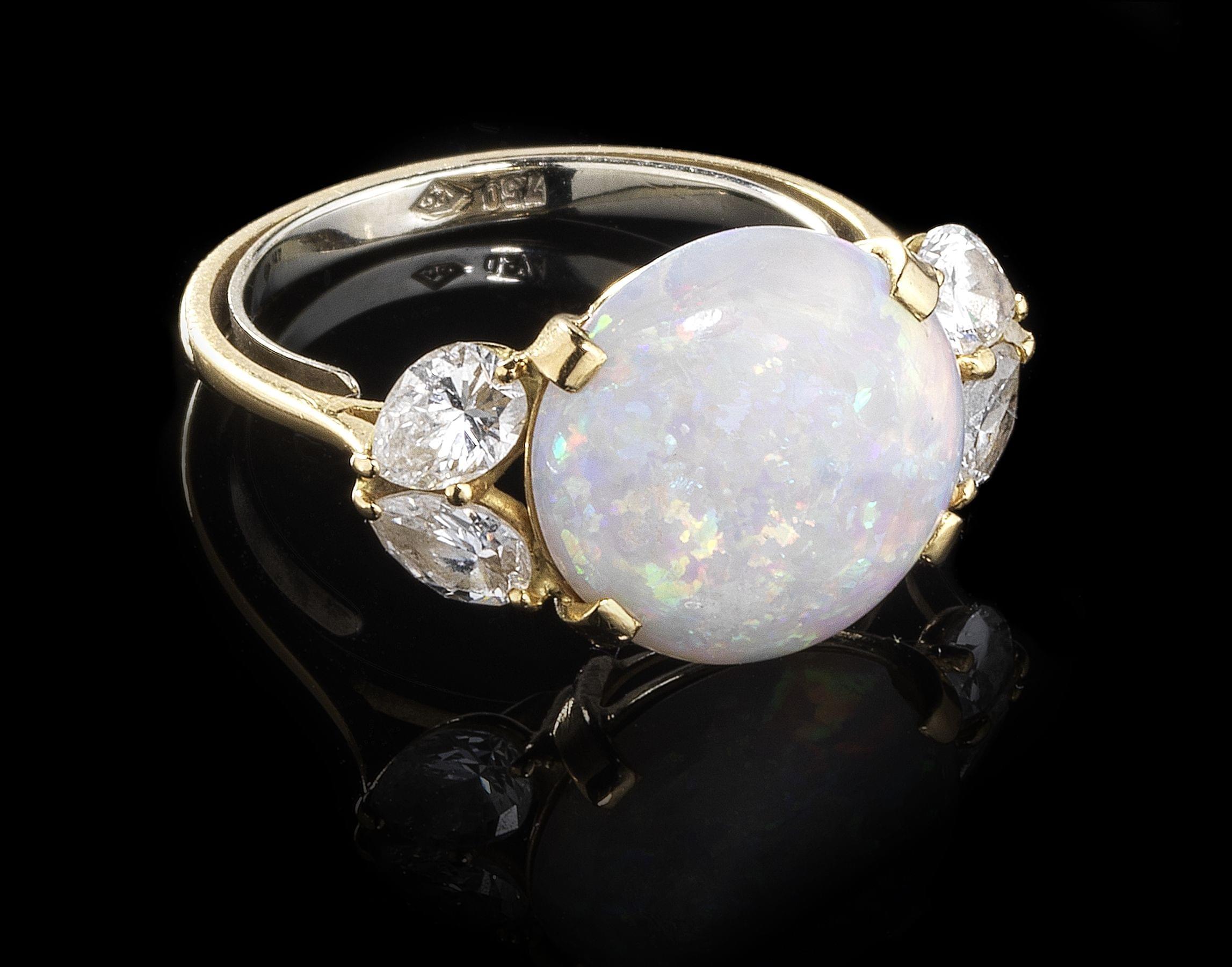 34. Bague sertie d'une opale taille cabochon ronde à fond blanc (env. 3 ct) épaulée de diamants taille poire (env. 0,8 ct)
