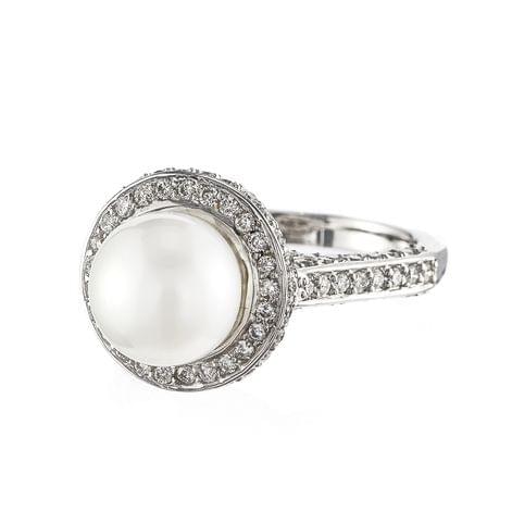 283. Bague sertie d'une perle (8 mm) entourée et épaulée de diamants (env. 0.9 ct)